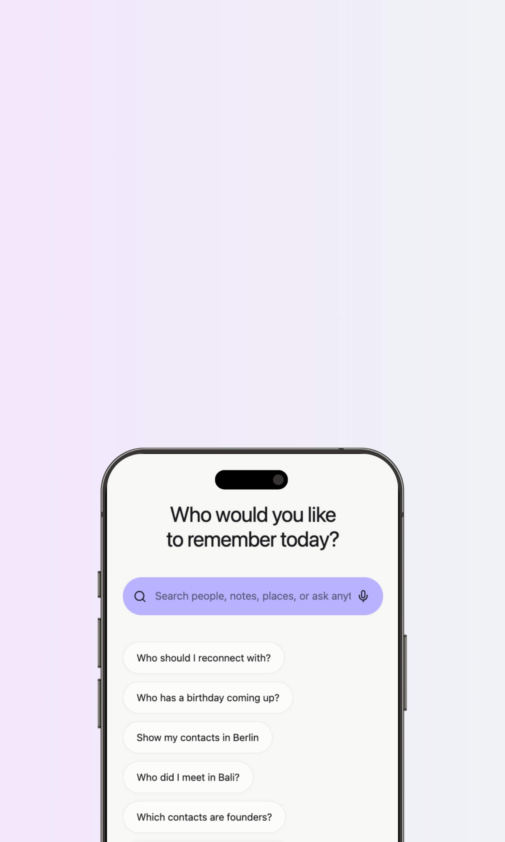 Find anyone by name, place, conversation, or question. Your network, instantly searchable.